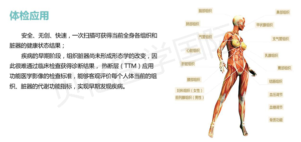 熱斷層(TTM)技術(shù)作為一種被動(dòng)接收人體組織細(xì)胞代謝熱,以功能學(xué)為主的醫(yī)學(xué)影像設(shè)備,在醫(yī)學(xué)影像界首次實(shí)現(xiàn)了圖像自動(dòng)分析,無需醫(yī)生解讀圖像,可在一分鐘內(nèi),快速提供健康檢查結(jié)果。