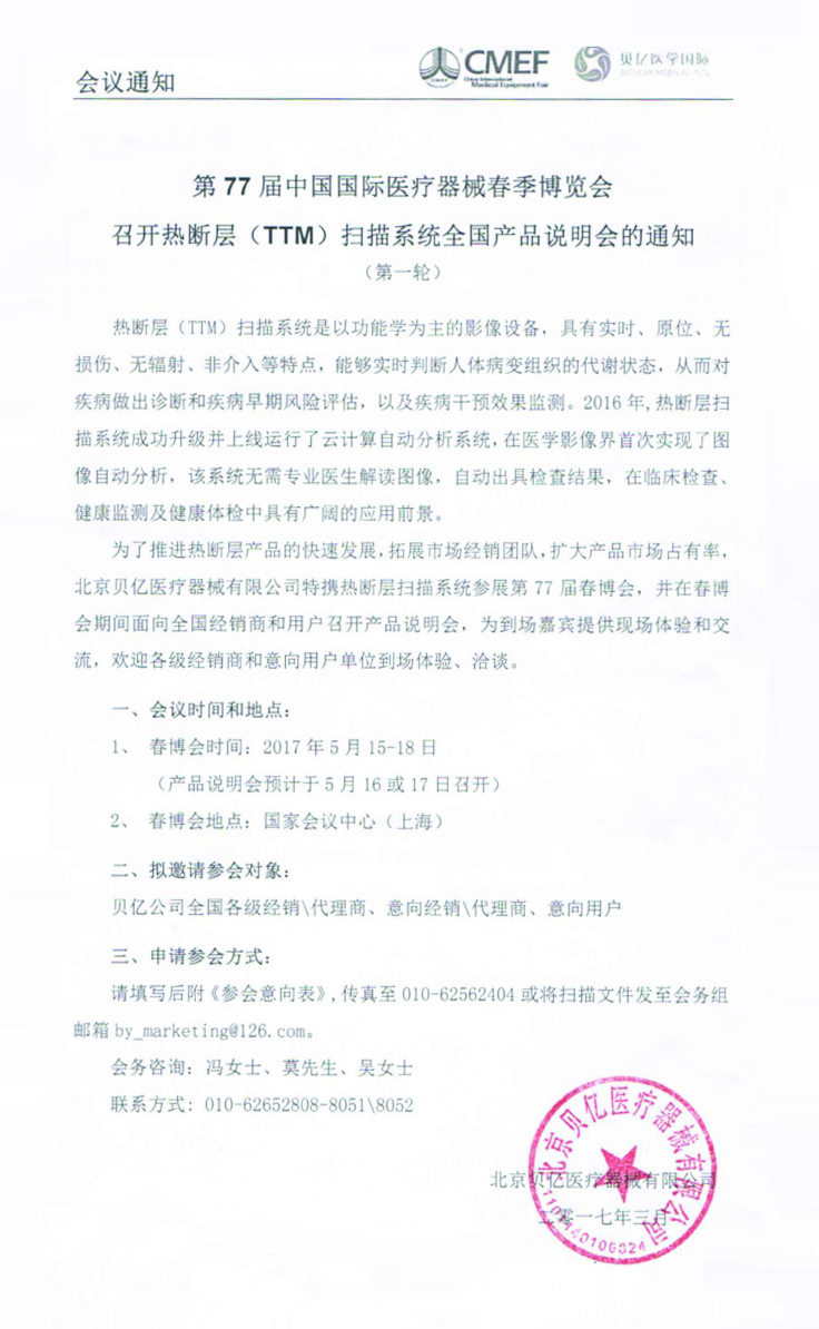 關(guān)于第77屆中國國際醫(yī)療器械博覽會 召開熱斷層(TTM)掃描系統(tǒng)全國產(chǎn)品說明會的通知 (第一輪)