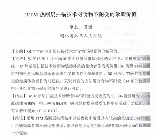 大會論文匯編收錄了湖北省第三人民醫(yī)院編寫的《TTM熱斷層掃描技術(shù)對食物不耐受的診斷價值》,研究結(jié)果顯示采用TTM熱斷層掃描技術(shù)診斷食物不耐受具有較高的靈敏度、特異性。