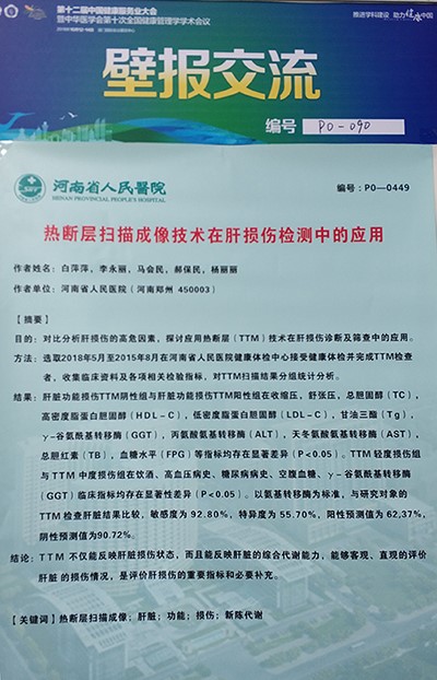 大會壁報展示了河南省人民醫(yī)院的《熱斷層掃描成像技術在肝損傷檢測中的應用》學術論文,文章對比分析了肝損傷的高危因素,探討應用熱斷層(TTM)技術在肝損傷診斷及篩查中的應用,結論表明TTM不僅能反應肝損傷狀態(tài),而且能反應肝臟的綜合代謝能力,能夠客觀、直觀的評價肝臟的損傷情況,是評價肝損傷的重要指標和必要補充。